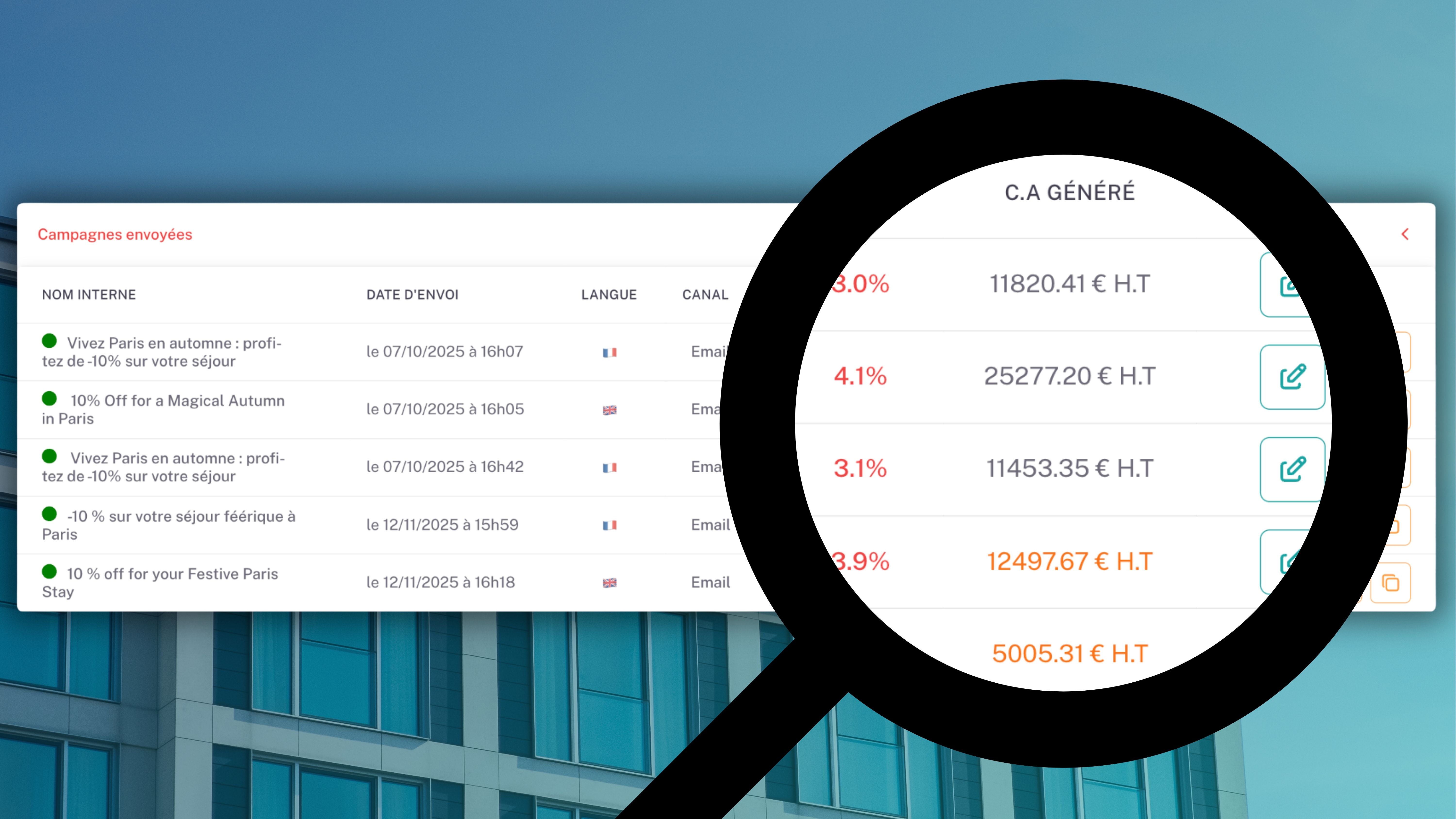 Vos campagnes génèrent du revenu direct, mesuré automatiquement : ouvertures, clics, réservations, paniers moyens…
